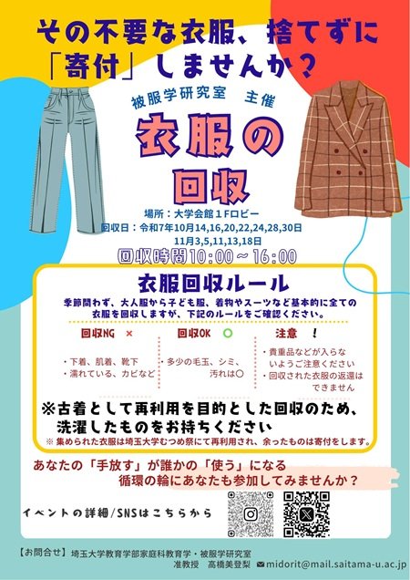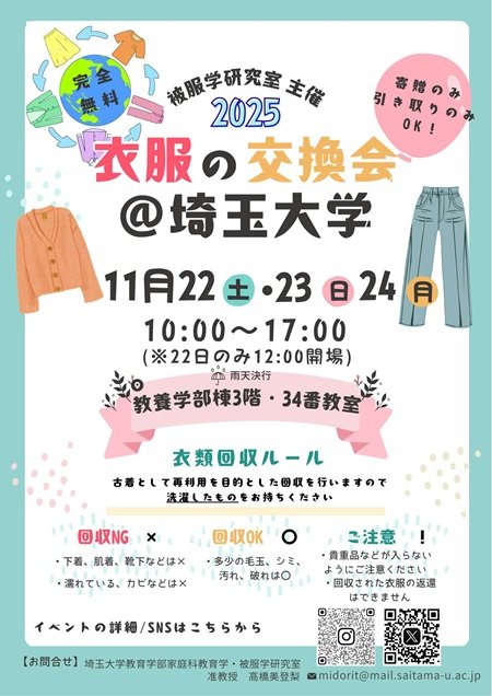 「衣服の交換会@埼玉大学」を実施します 2025/11/14埼玉大学教育学部家庭科教育学?被服学研究室主催で、11月22?24日に行われる埼玉大学むつめ祭で衣服の交換会をします。寄付のみ?引き取りのみOK!完全無料のイベントです。詳細はチラシをご確認ください。クリックするとPDFで表示されますクリックするとPDFで表示されます