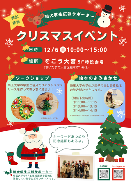 | 内容 | 埼玉大学の学生広報サポーターが、ワークショップや絵本の読み聞かせでクリスマスを盛り上げます。自分だけのクリスマスリースを作っておうちに飾ろう! ■対象:未就学児~小学生程度 ※保護者の方と一緒にご参加をお願いいたします。 イベントチラシはこちら ![]() |